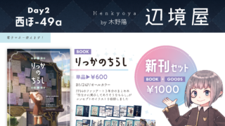 直前のお知らせで申し訳ございません!12月31日のコミックマーケット107(2日目)にサークル参加いたします。頒布物とお品書きはこちらになります。(準備ができしだい随時更新)辺境屋 水曜日西地区ほ-49a(西1ホール)・イベントには閉会時間...